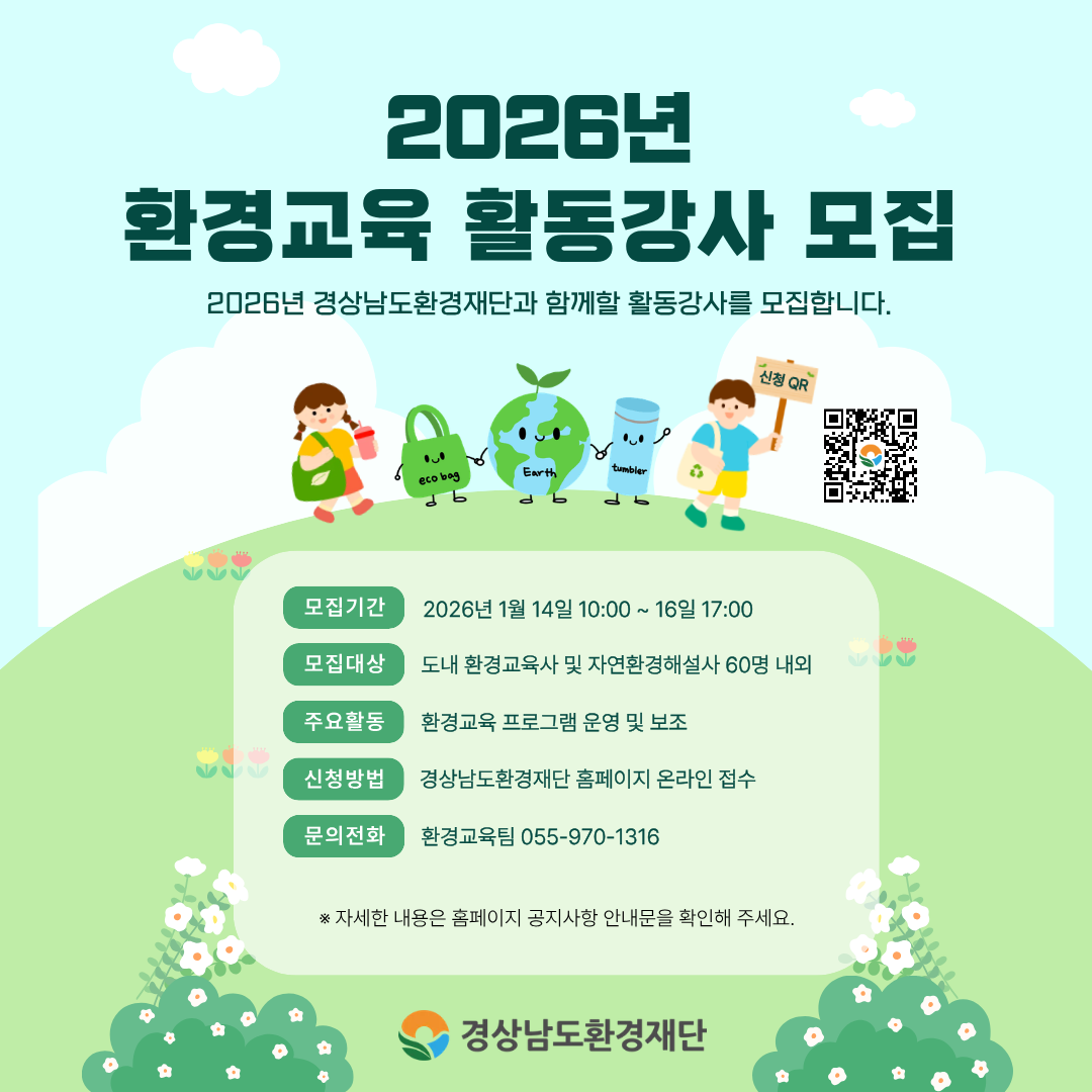 경상남도환경재단에서는 2026년 환경교육프로그램을 함께 운영할 환경교육 활동강사를 모집합니다.